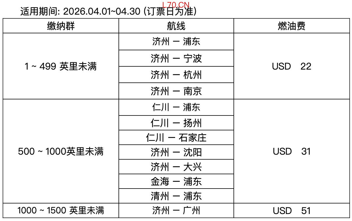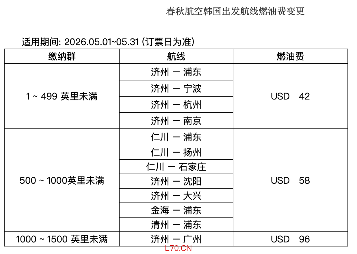 第一财经记者获悉,春秋航空已发布通知,上调韩国出发航线的燃油费,新规适用于订票日为5月1日-5月31日的机票。其中不足499英里的航线燃油费为42美元(约人民币287元),500-1000英里的燃油费为58美元(约人民币396元),1000-1500英里的燃油费为96美元(约人民币656元)