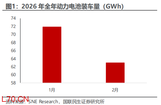 根据SNE Research发布的2026年1-2月全球动力电池装车量月度追踪报告,2026年1-2月,全球电动汽车(含EV、PHEV、HEV)动力电池总装车量为134.9GWh,较去年同期增长4.4%。从单月波动情况来看,1月全球装车量为71.9GWh,2月单月装车量则回落至63GWh,同比下滑12.4%。