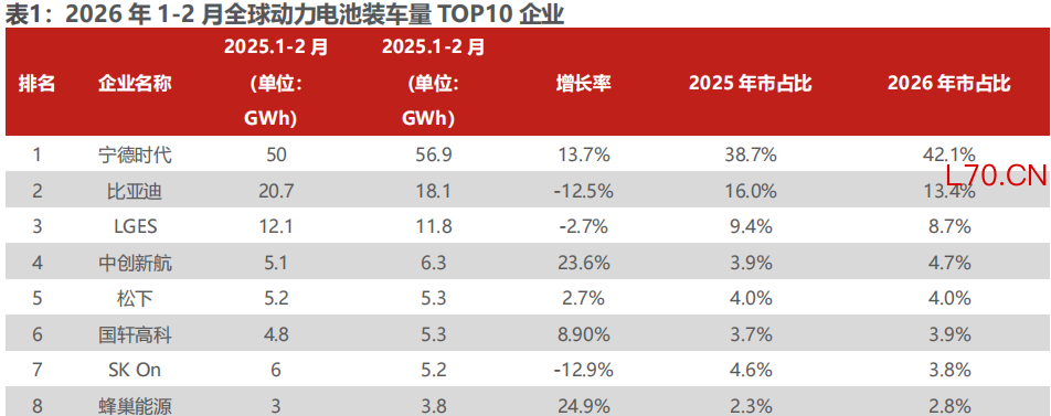 2026年1-2月的全球动力电池装车量前十名企业排名与同年1月相比完全一致,整体格局保持稳定。前十名企业依次为:宁德时代、比亚迪、LG新能源、中创新航、松下、国轩高科、SK On、蜂巢能源、亿纬锂能(维权)以及三星SDI。