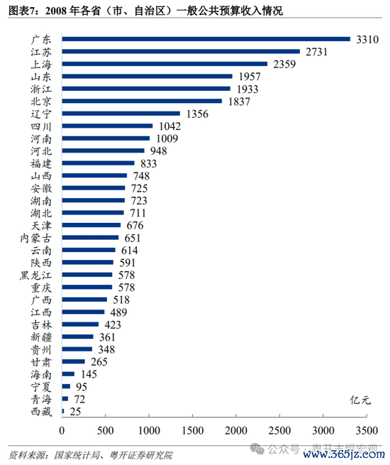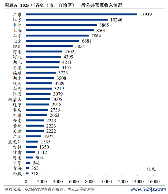 沿海地区财政长期相对丰裕,广东、江苏、浙江、上海和山东等沿海地区的财政收入长期名列前茅。新中国成立初期,由于财政体制主要采用了高度集中、统收统支的模式,地方财政收入与当地经济发展情况的匹配度不高。1950-1957年,山东、广东、江苏三省财政收入保持前三名,三者间排名或有更替。1958年,为了调动地方积极性,在中央统一领导下扩大了地方财政管理权限,适当增加地方财力。1959年,上海财政收入突跃榜首,并保持第一至1990年。1991年以后,广东财政收入超过上海,位居第一并保持至今,2021年达1.41万亿元高点(其后2022-2025年广东财政收入受房地产等影响均未超过2021年),这直接源于广东省经济总量长期排全国第一。广东凭借机械、纺织、制药、服务等优势产业发展,以及全国第一的人口、丰富资源、技术优势、“粤港澳”国家战略优势等实现了连续37年GDP稳居全国第一,因此也占据财政收入榜首。近三年尽管经济面临多重压力,广东财政收入有所波动,2025年达1.39万亿元,仍连续35年位居全国首位。我国加入世界贸易组织后,长三角地区融入国际大循环,经济和财政实力显著增强,2001年浙江财政收入升至前五,2002年江苏升至前三。江苏凭借与广东相似的外向型经济模式以及其独有的“苏南模式”,经济发展较好,2006年开始排名全国第二。2025年江苏经济稳中向好,财政收入连续两年站稳万亿元台阶,达1.02亿元,连续20年位居全国第二位。浙江的民营经济活跃,对经济和财政收入的带动作用明显,2019年浙江财政收入升至前三。山东财政收入在1956-1958年一度占据第一位置,此后相继被辽宁、江苏等超越,近年来深化经济新旧动能转换,财政收入排名在江浙沪之后。