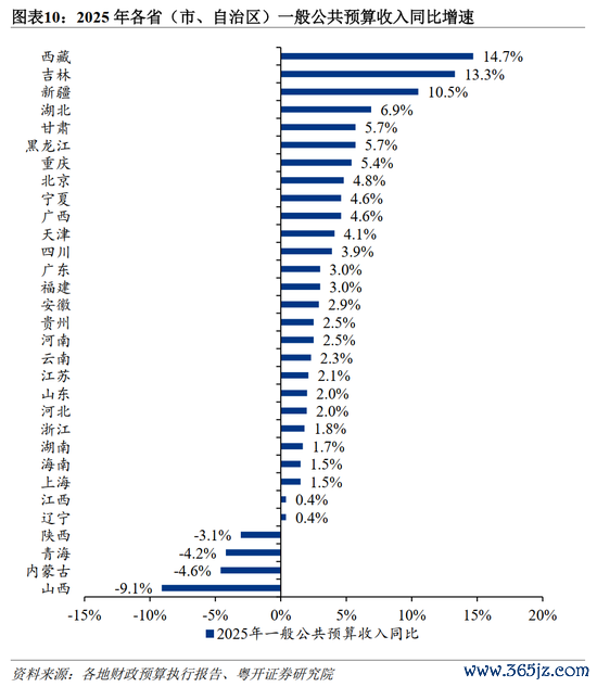 经济与财政是一体两面的关系,区域经济格局变化引发财政收入表现分化。2022年以来,西部省份一般公共预算收入整体增速快于东部和中部。这种格局的变化主要源于百年未有之大变局背景下,能源安全的重要性抬升,“一带一路”的重要性上升,西部资源密集型省份经济和财政收入增长相对较快;而东部和中部省份遭遇外需下行、房地产低迷等多重压力,经济结构和产业结构持续调整,财政收入增速相对偏慢。经过持续的新旧动能转换,房地产持续调整并接近触底以及人工智能、机器人等迅速发展,东部财政经济又产生新气象。2025年,东部地区财政收入增速加快修复,东部地区依托扎实的产业基础、持续恢复的民营经济活力,通过发展新兴产业优化税源结构,增值税和企业所得税增长较快,对冲了房地产调整带来的压力。中部地区经济结构正处于转型升级关键期,叠加外需走弱、房地产市场低迷等挑战,财政收入增长压力较大,区域内分化加剧,湖北财政收入跻身全国前十,但安徽、山西排名下滑。西部地区财政收入受大宗商品价格波动影响显著,在经历能源安全驱动的高速增长后,2025年增速有所回落,山西、内蒙古等部分省份财政收入出现负增长。
