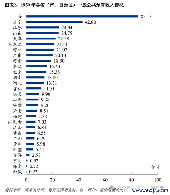 中国经济不是纯粹的西方经济学,而是政治经济学,财政是集中体现。地方财政收入取决于其经济基础和财政体制。地方财政收入取决于其经济基础和财政体制。1949年新中国成立以来,我国经历了从计划经济到市场经济,从农业农村到工业化和城镇化的进程,从高度集中统收统支的财政体制到分税制的变化,这一系列体制的变革直接影响了各地的财政收入。财政收入与经济发展高度相关。2001年至今,财政收入前五名都由广东、江苏、浙江、上海和山东五个省市包揽。其中,广东、江苏、浙江和山东财政收入排名与地方GDP排名总体匹配,体现地方财政收入水平与地区整体经济活动水平密切相关。需要说明的是,浙江虽GDP落后于山东,但因其数字经济和平台经济发达,税收集中度高,财政收入排名超过山东;上海GDP位居前十,但其发达的房地产、批发零售、金融、商务服务、交通运输等服务业以及繁荣的外贸外资创造涉外税收对财政收入贡献率高,使其财政收入保持前五。