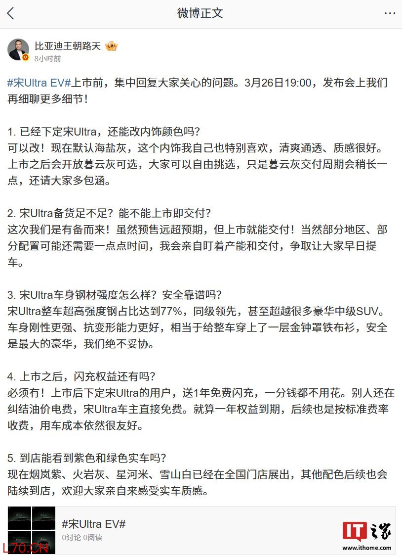 比亚迪王朝路天:宋 Ultra EV 上市就能交付,将开放暮云灰内饰可选
