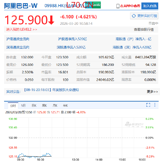3月20日消息,阿里巴巴盘中跌超6%,最低触及123.5港元,创去年8月以来新低;阿里巴巴美股隔夜收跌超7%,报124.9美元。