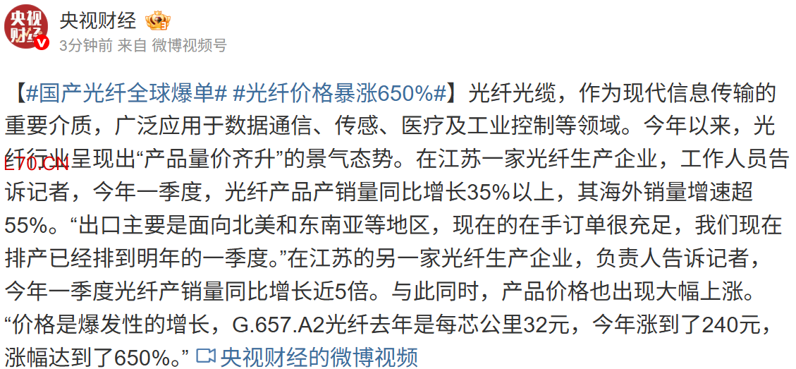 国产光纤全球爆单 部分产品价格暴涨650%